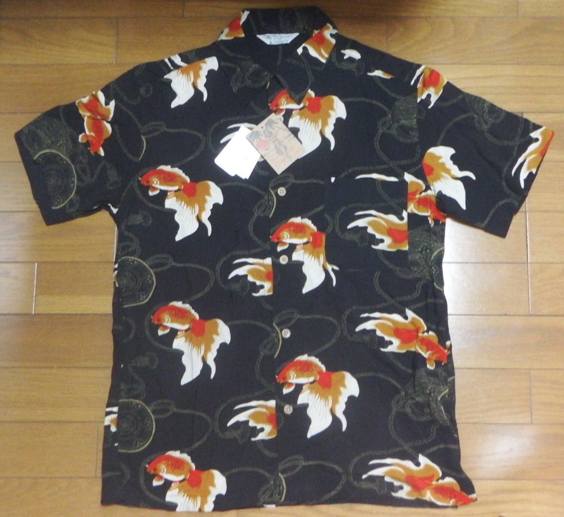 - タグ付 未着用品 HAWAIIAN SURF BRAND 金魚 アロハシャツ Mサイズ レーヨン100% 黒 総柄 ハワイアン サーフ ブランド