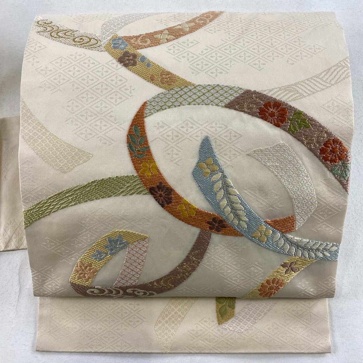 - 名古屋帯 名品 葛帯 草花 刺繍 クリーム 正絹 【中古】