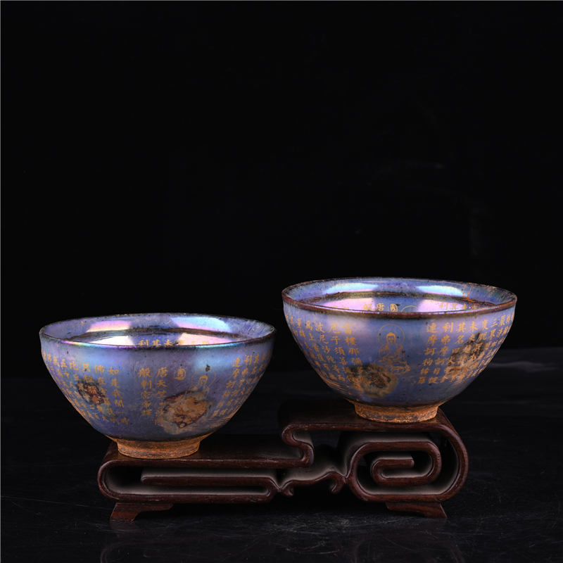 > 宋代風 古陶磁器 建窯 七彩光 鐵胎紫金釉 一対 描金 佛經 盃 建盞 茶盞 酒碗 供御款 陶芸 東洋彫刻 旧家蔵出し 唐物 中国古玩 古美術品