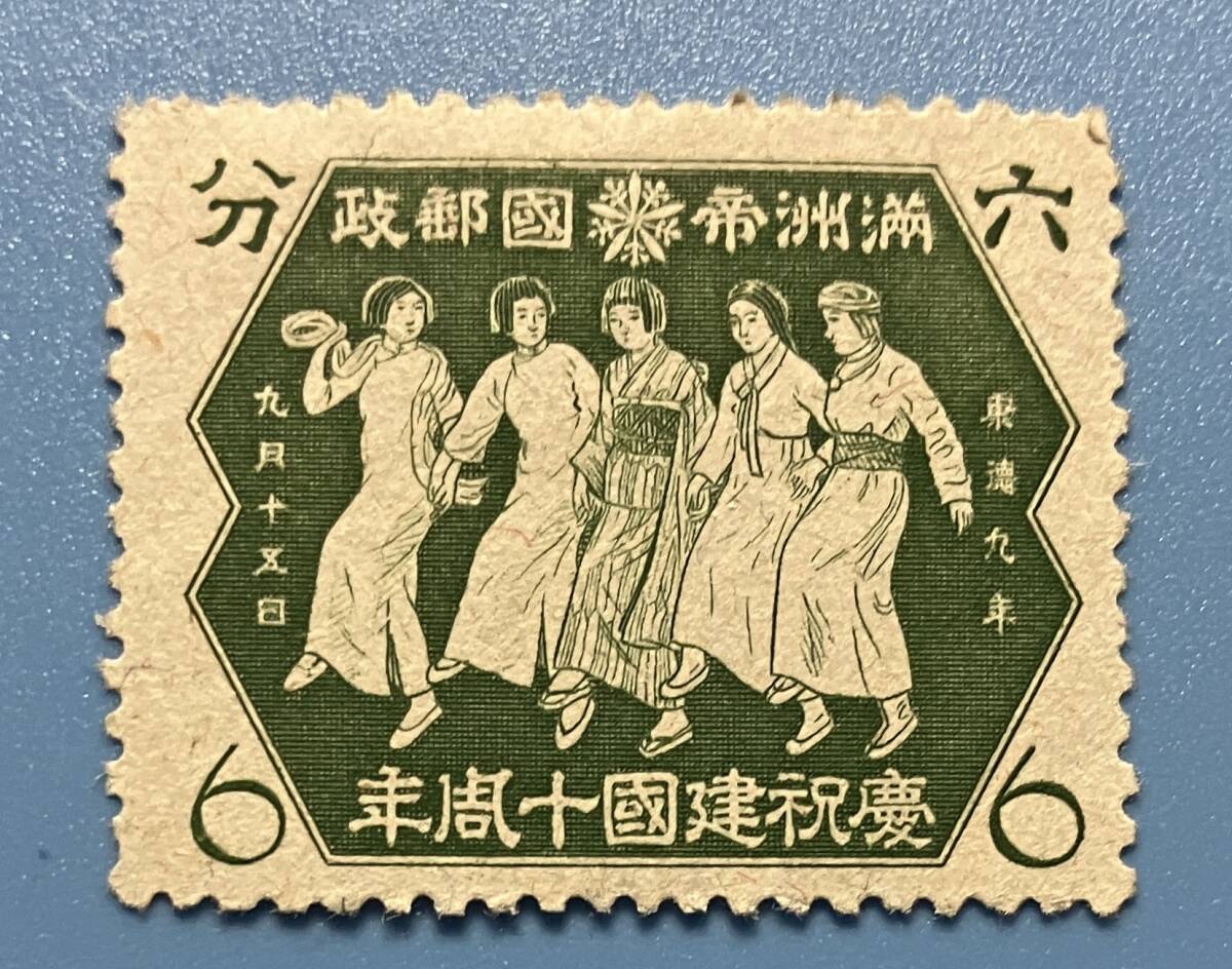 - 満州の切手★建国10周年 6分 1942年 裏のり無し ヒンジ跡 未使用
