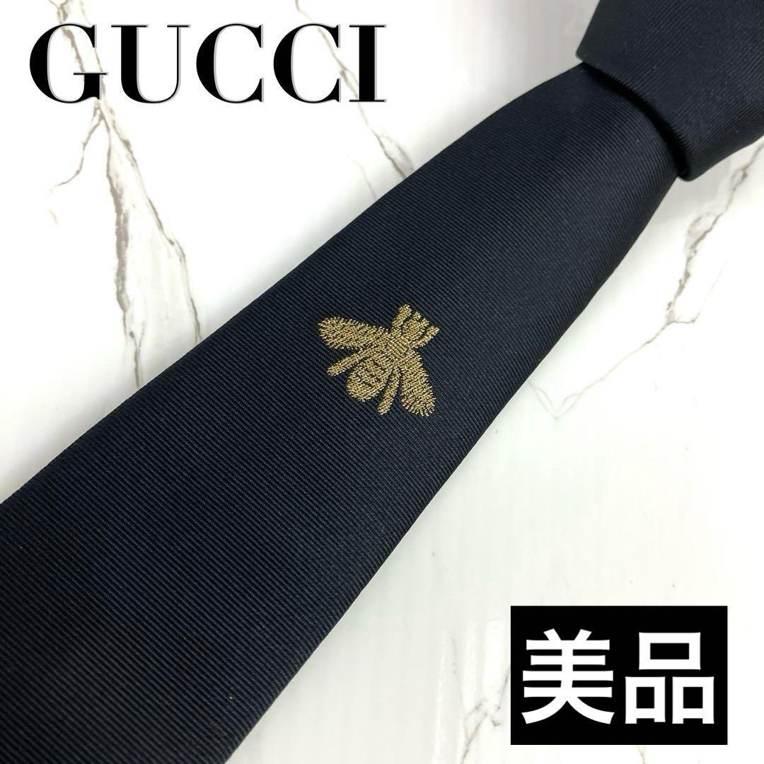 - 美品 GUCCI グッチ ネクタイ アニマリエ 蜂 bee ワンポイント刺繍 ソリッド ブラック 光沢 肉厚