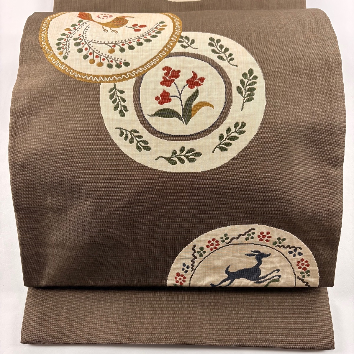 - 袋帯 美品 名品 木屋太 落款 動物 草花 茶色 六通 正絹 【中古】