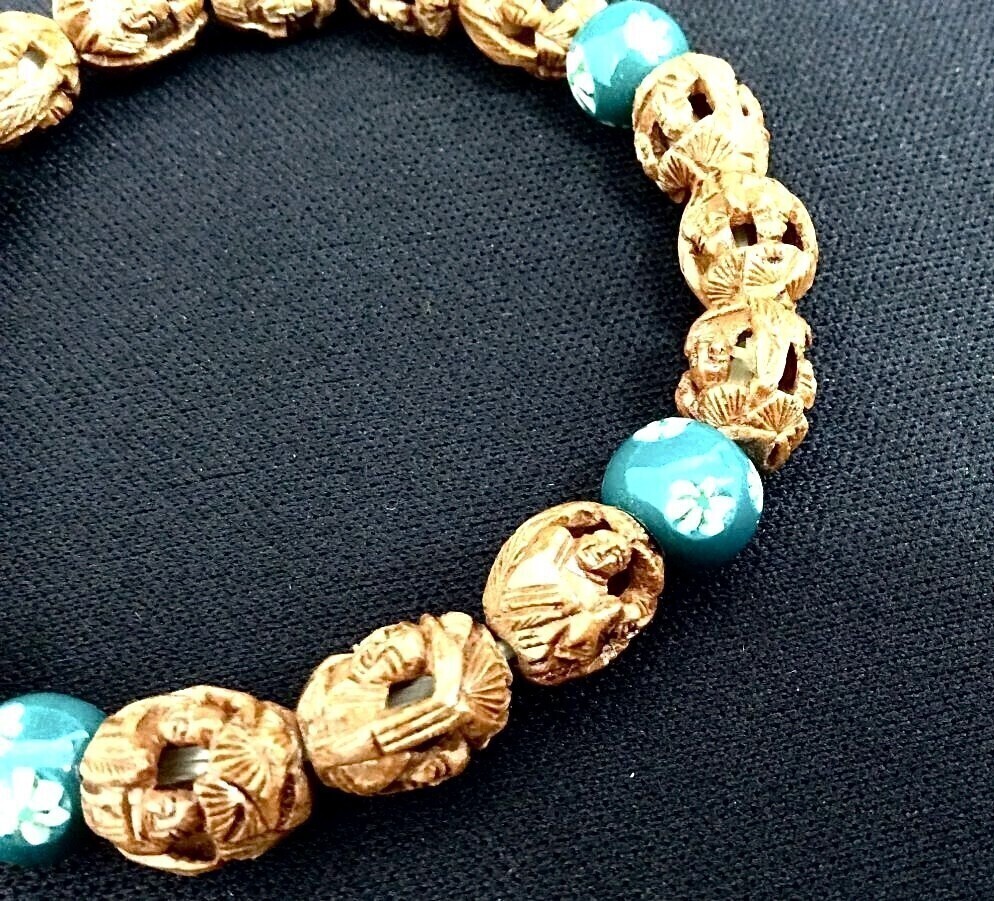 - とんぼ玉 蜻蛉玉 数珠 緑 羅漢 ブレスレット 彫刻 藤村トンボ玉工房 大阪府知事指定 伝統工芸品 仏教美術 箱付き 高級 中古品 管41968068