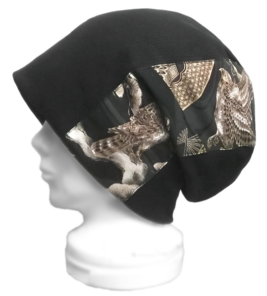 > ◇送料無料◇ ハンドメイド◆和柄[鷹文様]ルーズワッチキャップ◆コットンニット/黒 ◇ゆったりサイズ・小顔効果・長いシーズン着用◇
