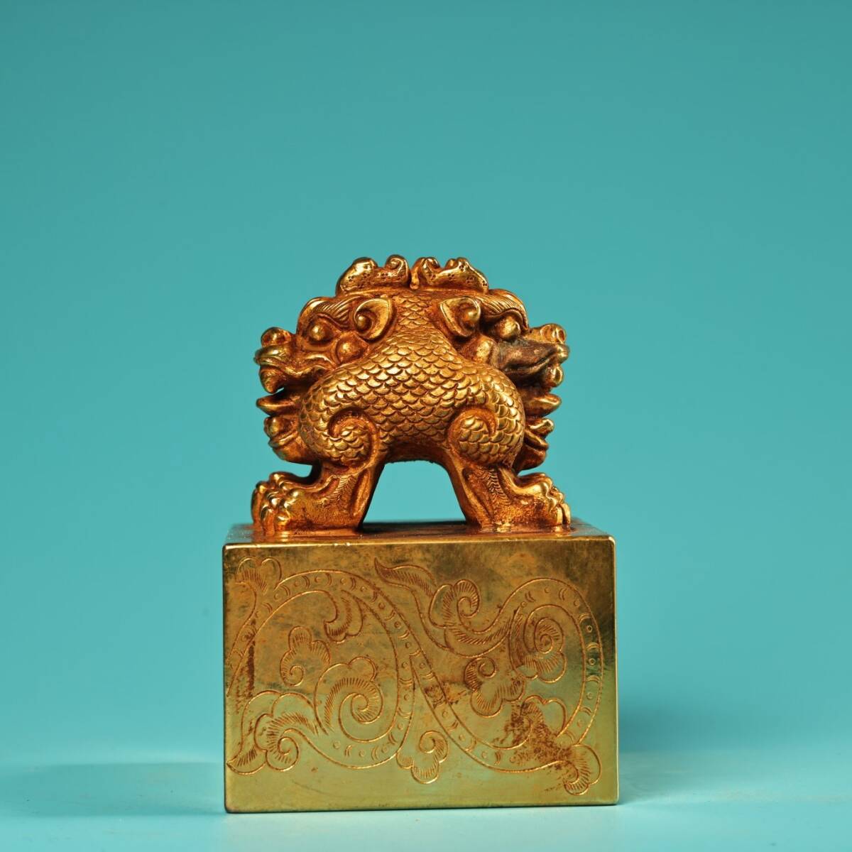 - ▽鴻▽ 銅製 塗金 雙龍頭印章 置物 賞物 古賞物 古董品 時代物 稀少珍品 中国古玩 中国古美術
