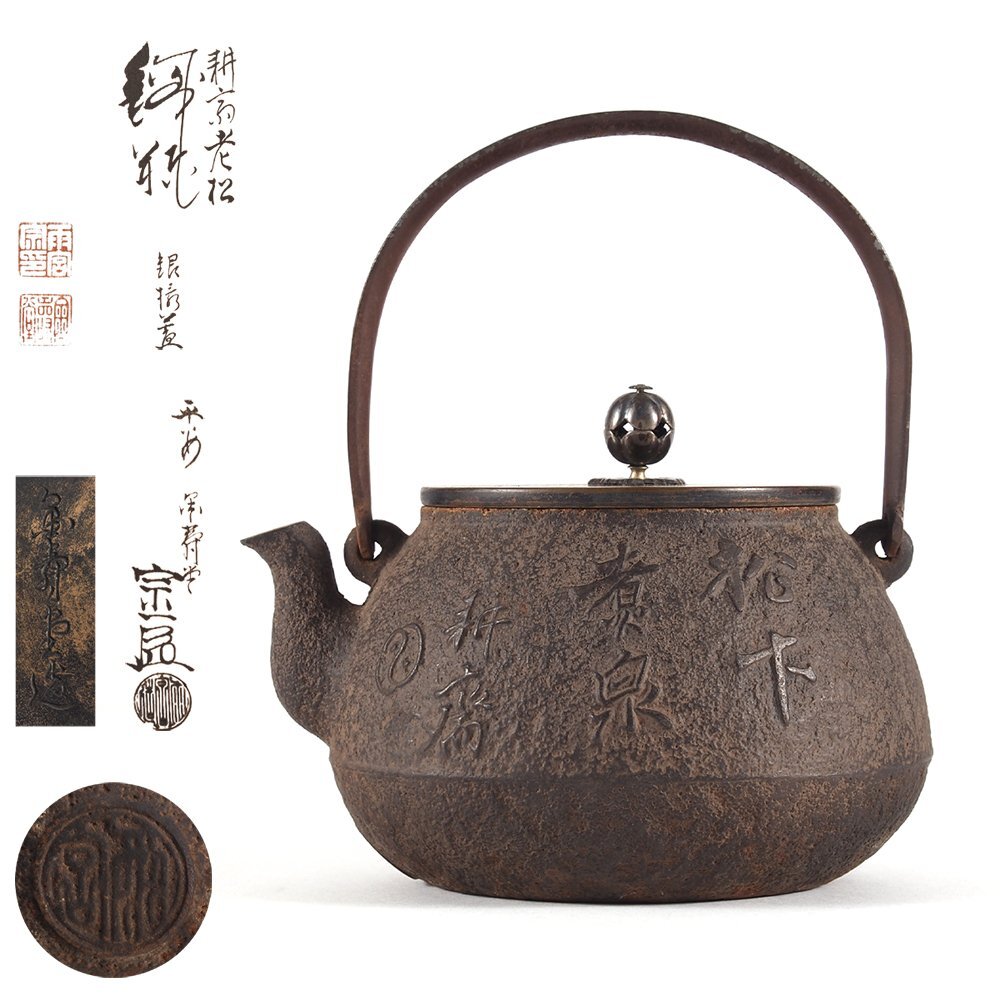 【夢工房】 平安 金寿堂 名人 雨宮 宗 造 銀摘蓋 耕斎 漢詩 老松地紋 平宝珠形 鉄瓶 共箱 PE-095