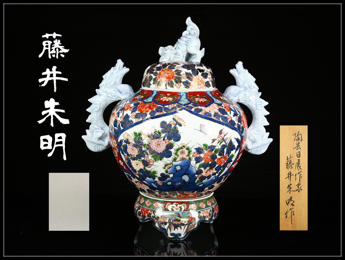 > 【吉】CM818 日展作家 有田名工 【藤井朱明】 染錦花紋 三段 大香炉 高48㎝/共箱付 美品Ng!