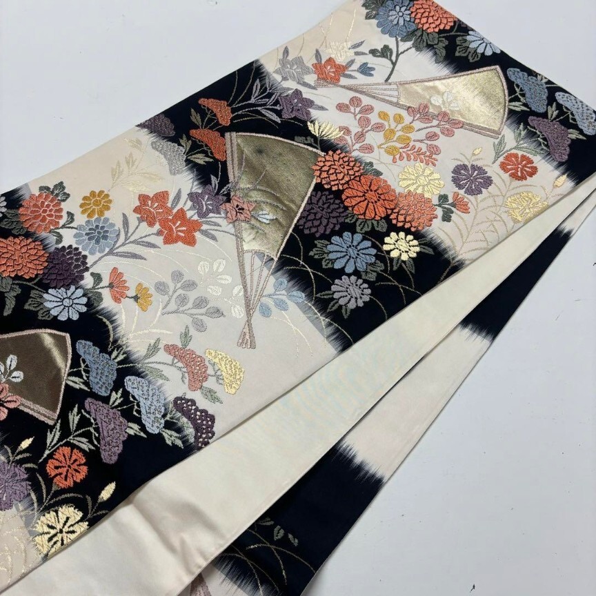 - 【楓】豪華唐織 袋帯 正絹 六通 黒地き白地 花に扇 六通 KU-813