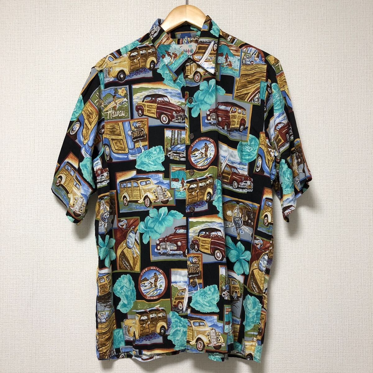 > (k) 90s 90年代 Reyn Spooner レインスプーナー ハワイ製 SPUN RAYON レーヨン 半袖 アロハシャツ メンズ サイズS 総柄 ブラック系