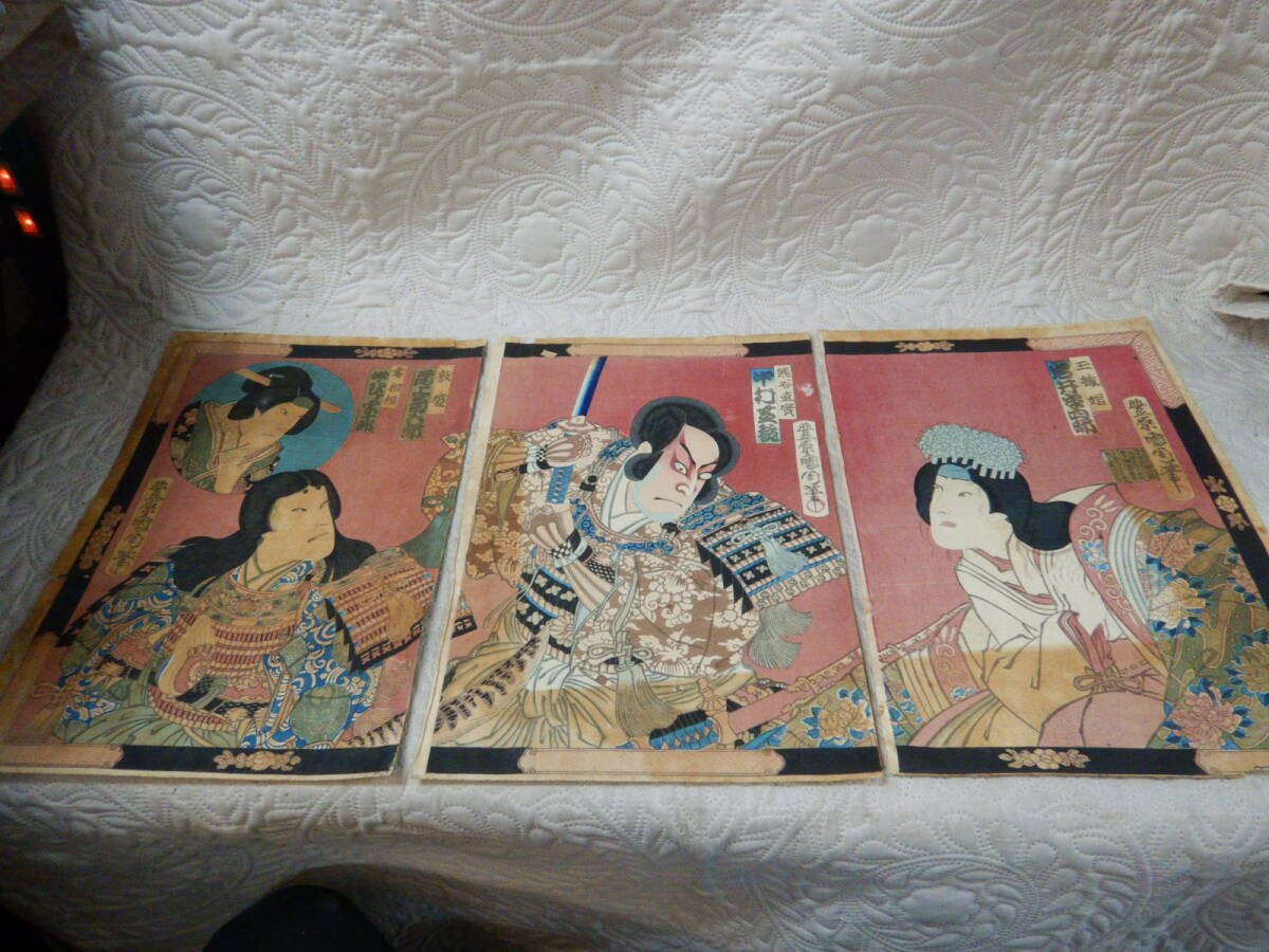 - 浮世絵 版画 三枚 中村芸翫 岩井半四郎 國周筆 アンティーク 骨董 木版画 焼けやシミはあります