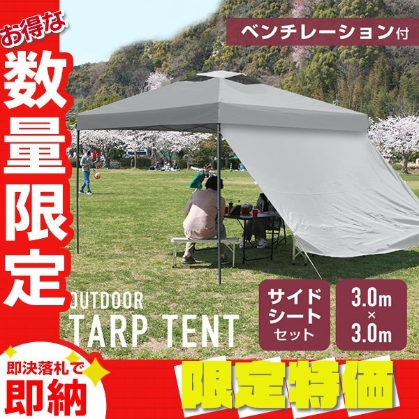 - 【限定セール】サイドシート付 タープテント 3m ベンチレーション 収納ケース 撥水 スチールフレーム UVカット アウトドア BBQ グレー