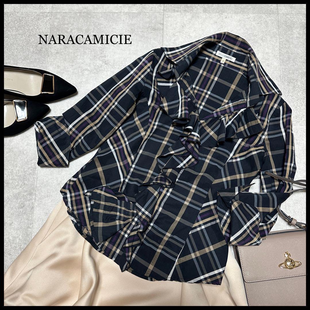 - NARACAMICIE ナラカミーチェ フリルブラウス チェック 7分袖 美ライン 黒 パープル M.
