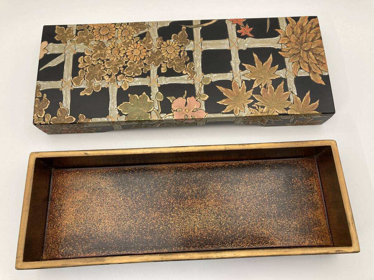 - 「9706」本金梨地 時代金蒔絵 蒔絵箱 小物入 花柄 横約257mm/奥行約98mm/高さ約38mm 長方箱 古美術品 漆盒 骨董品