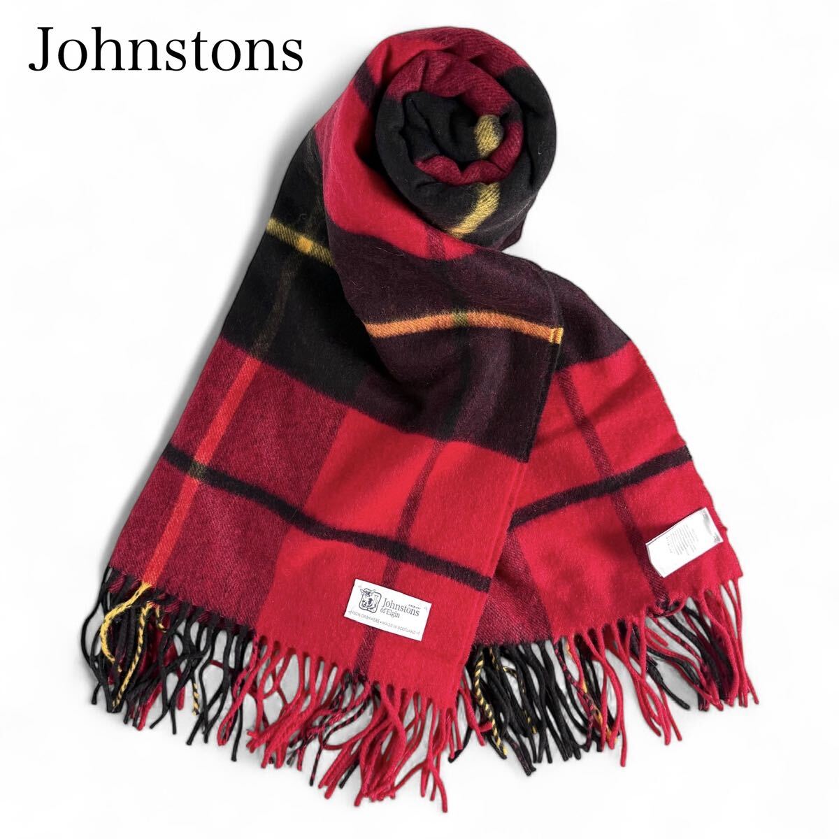 > Johnstons ジョンストンズ 大判ストール カシミヤ100 マフラー ショール ブランケット フリンジ チェック カシミア レッド 190×70