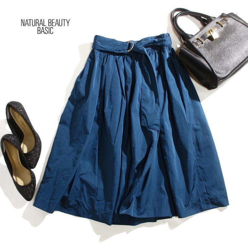 - 美品 ナチュラルビューティーベーシック NATURAL BEAUTY BASIC 艶 ミモレ丈 ベルト付き ギャザー フレアスカート M ネイビー 紺 上品 綺麗
