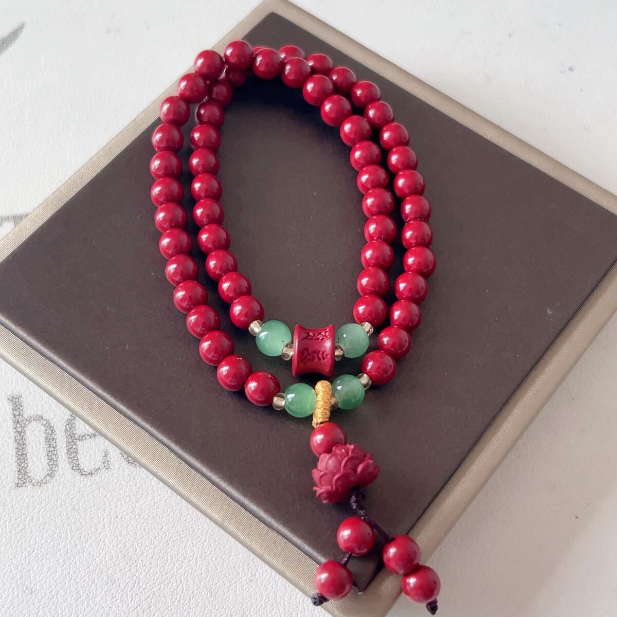 - ◇シナバー(辰砂)+人工石(緑色)4粒◇ブレスレット◇パワーストーン◇蓮花+真言◇巾着袋付き◇プレゼントにも037B9265