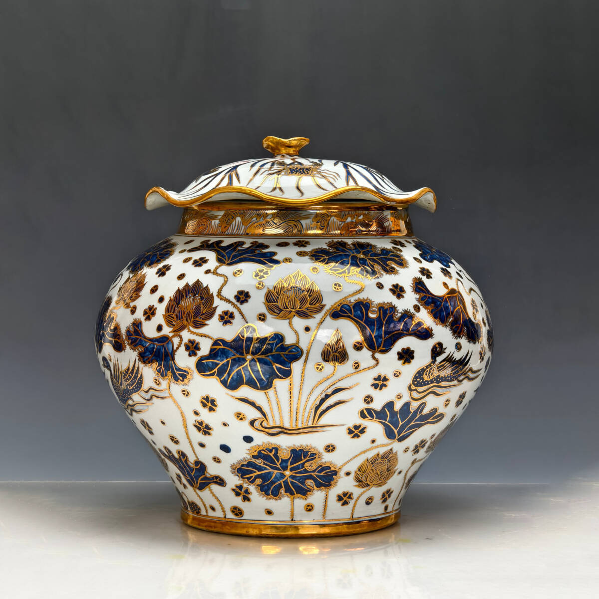 - 9+GV9724「東洋美術」 中国骨董 人間国宝 磁器製品【青白金箔蓮池鴛鴦文様蓮葉蓋壺】 旧物 孤品 珍品 陶磁器 収蔵価値が高い