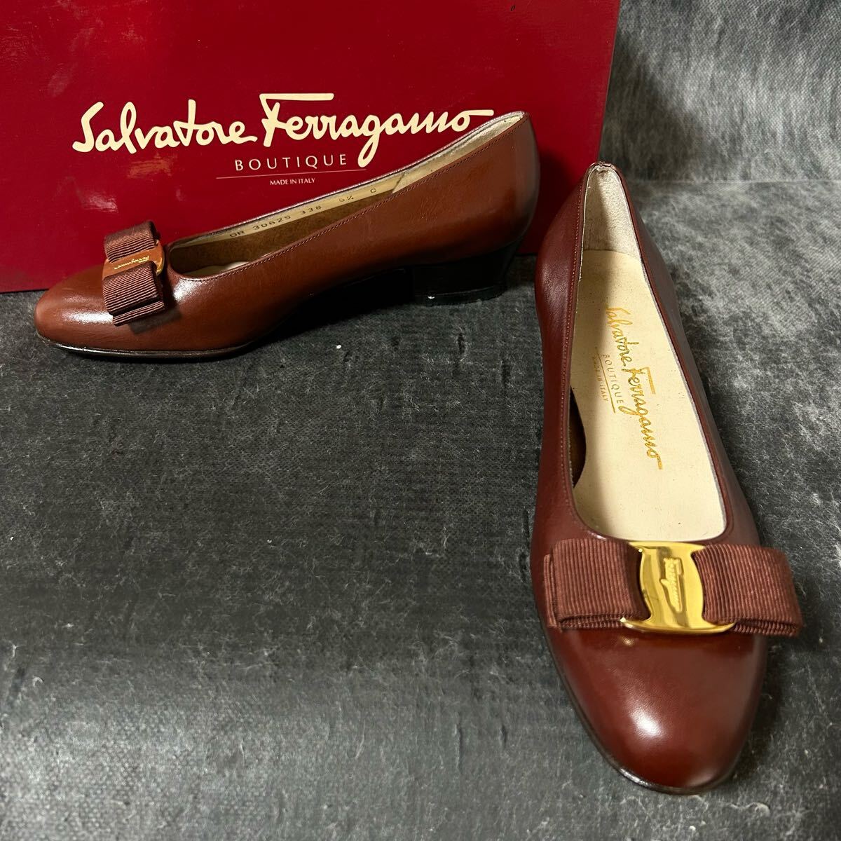 - 新品同様 Salvatore Ferragamo サルバトーレ・フェラガモ ヴァラ リボンパンプス パンプス レザー 51/2C 23cm相当 ブラウン *EP