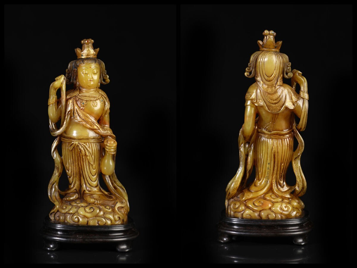 - 「清 甲辰玉セン作 老寿山石 田黄石彫り 観音造像」極細工 擺件 古賞物 中国古美術 旧蔵出