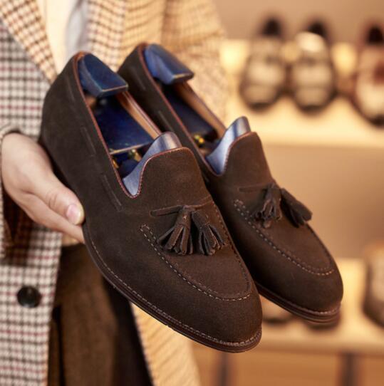 - 新入荷最上級 スエード革 メンズ ビジネスシューズ タッセルローファー 職人手塗り上げ 本革 レザーシューズ 牛革 革靴 珈琲色 26.5cm
