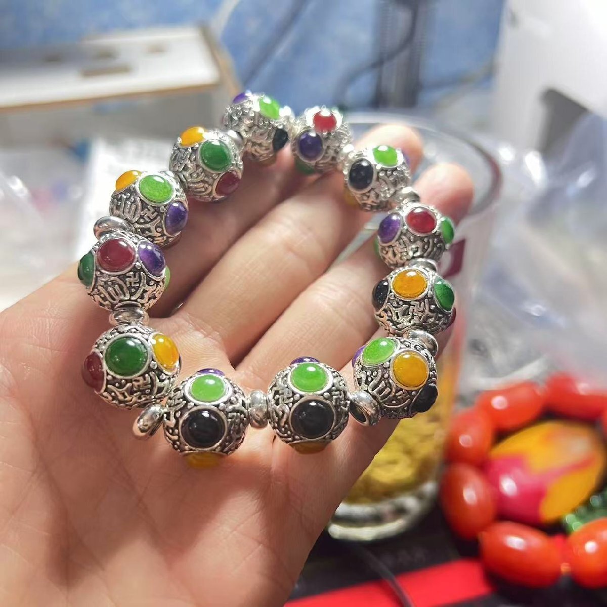 > 金属 チベット 銀 嵌七彩玉 多宝 ブレスレット 手串 透かし彫り 裝身具 護符 開運 風水 お守り 厄除け 装飾zhzx268