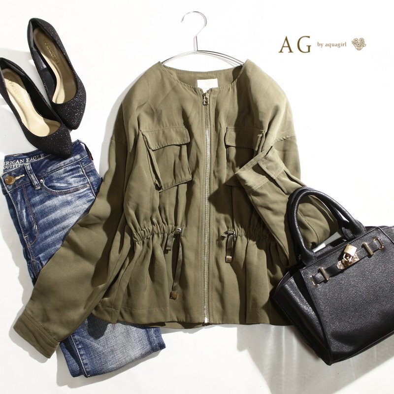 - 美品 AG by aquagirl エージー バイ アクアガール 株) ワールド 合物 ミリタリー ノーカラー ブルゾン S カーキグリーン 緑 モッズコート