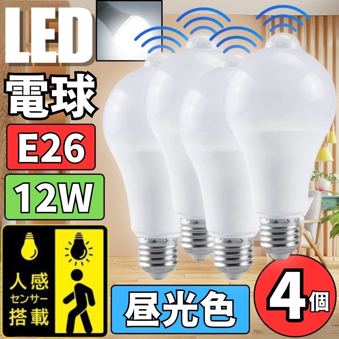 - LED電球 人感明暗センサー付 E26 12W 6500K 4個 昼光色ホワイト 明るさ80W相当 自動点灯 消灯 センサーライト 省エネエコ トイレ 廊下 玄関