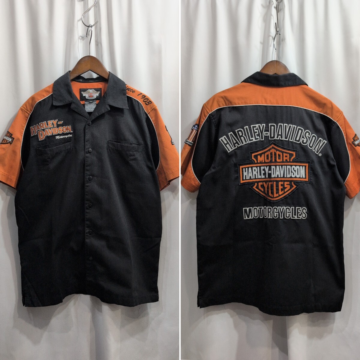 - Hurley-Davidson ハーレダビッドソン 半袖 ワークシャツ S メンズ 半袖シャツ ワッペン 黒 コットンポリ/バンソン/ショット/ノートン