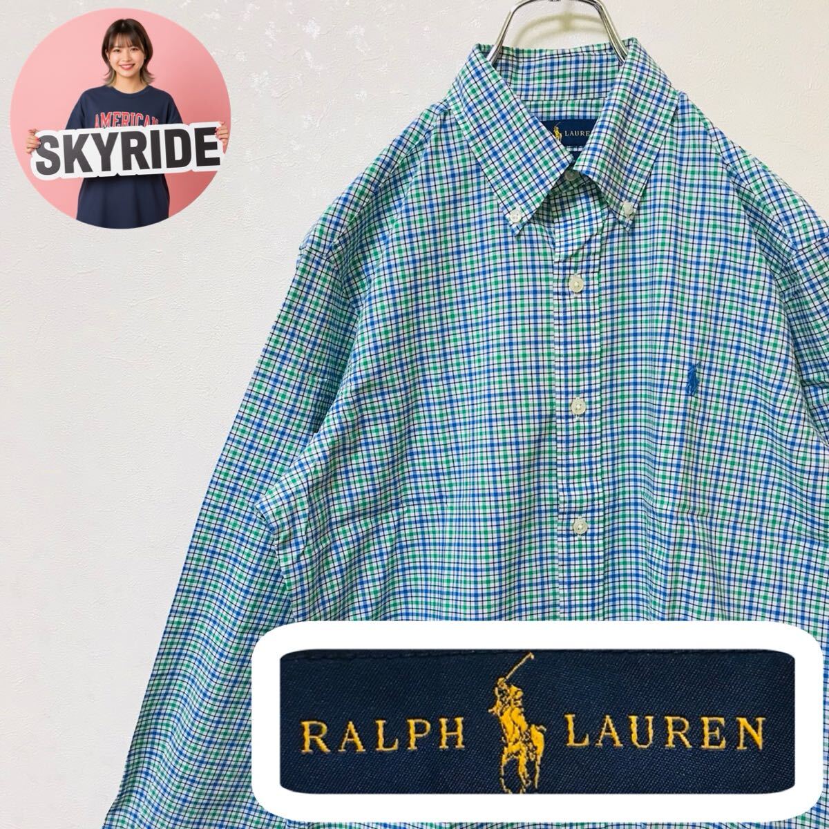 > 【人気】Ralph Lauren ラルフローレン 長袖シャツ グリーンチェック Sサイズ コットン100% ワンポイントロゴ ボタンダウン 古着 #TT0339