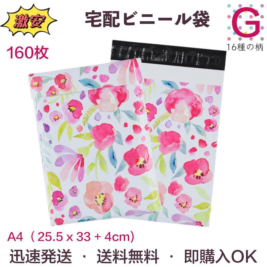> 宅配ビニール袋 【G花爛漫】25.5×33+4cm A4 宅配袋 ポリ袋 梱包袋 ビニール袋 防水袋 梱包資材 テープ付き 袋 160枚 家庭用 業務用