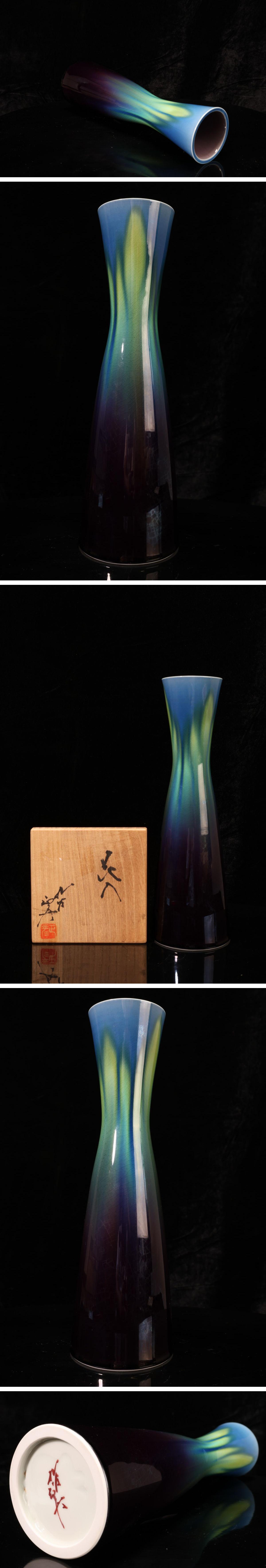 > 【珍品堂】1円から Y43-V08 九谷焼 八十吉作 徳田八十吉 碧明耀彩花入 在銘 花瓶 飾壺 花生 共箱 木箱 花器 陶芸家 美品 古美術 骨董品