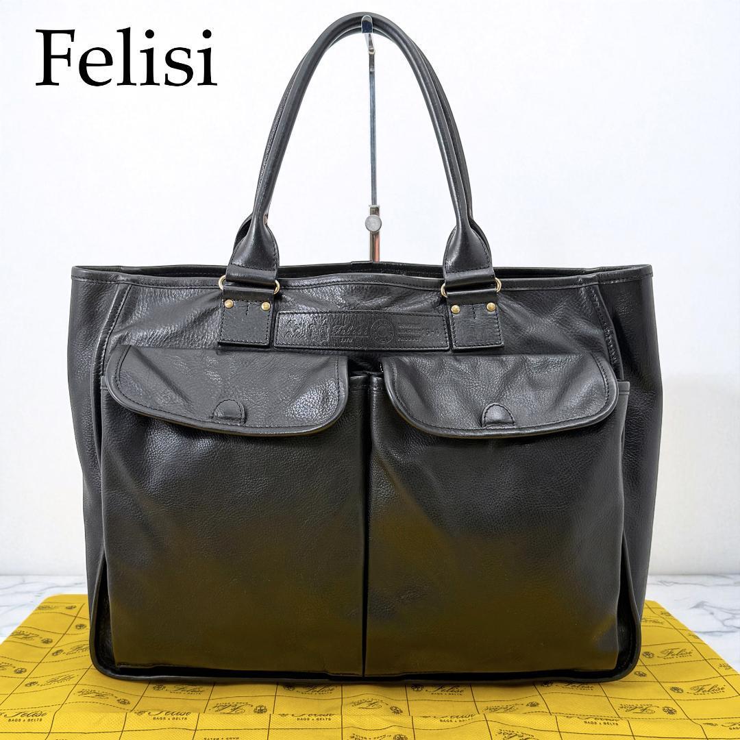 > 【美品】 フェリージ Felisi ビジネストート トートバッグ 大型 大容量 フロントポケット オールレザー 15-4 15/4 ヘルメットバッグ 黒