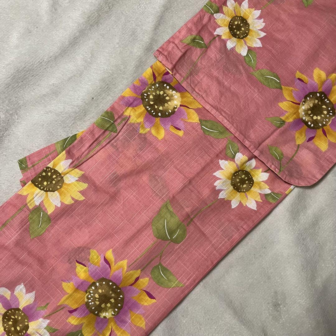 - 浴衣 ピンク ひまわり 大きめ しつけ有 手縫いミシン併用 アトリエサブ ATELIER SAB ゆかた 変わり織 生地日本製