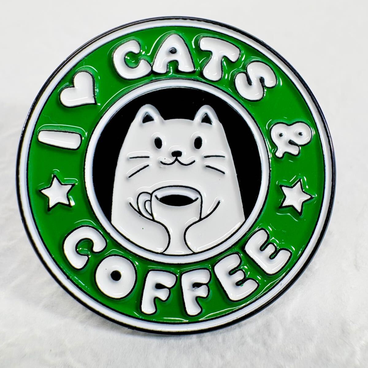 - 【ピンバッジ】白猫さん I LOVE CATS & COFFEE パロディ