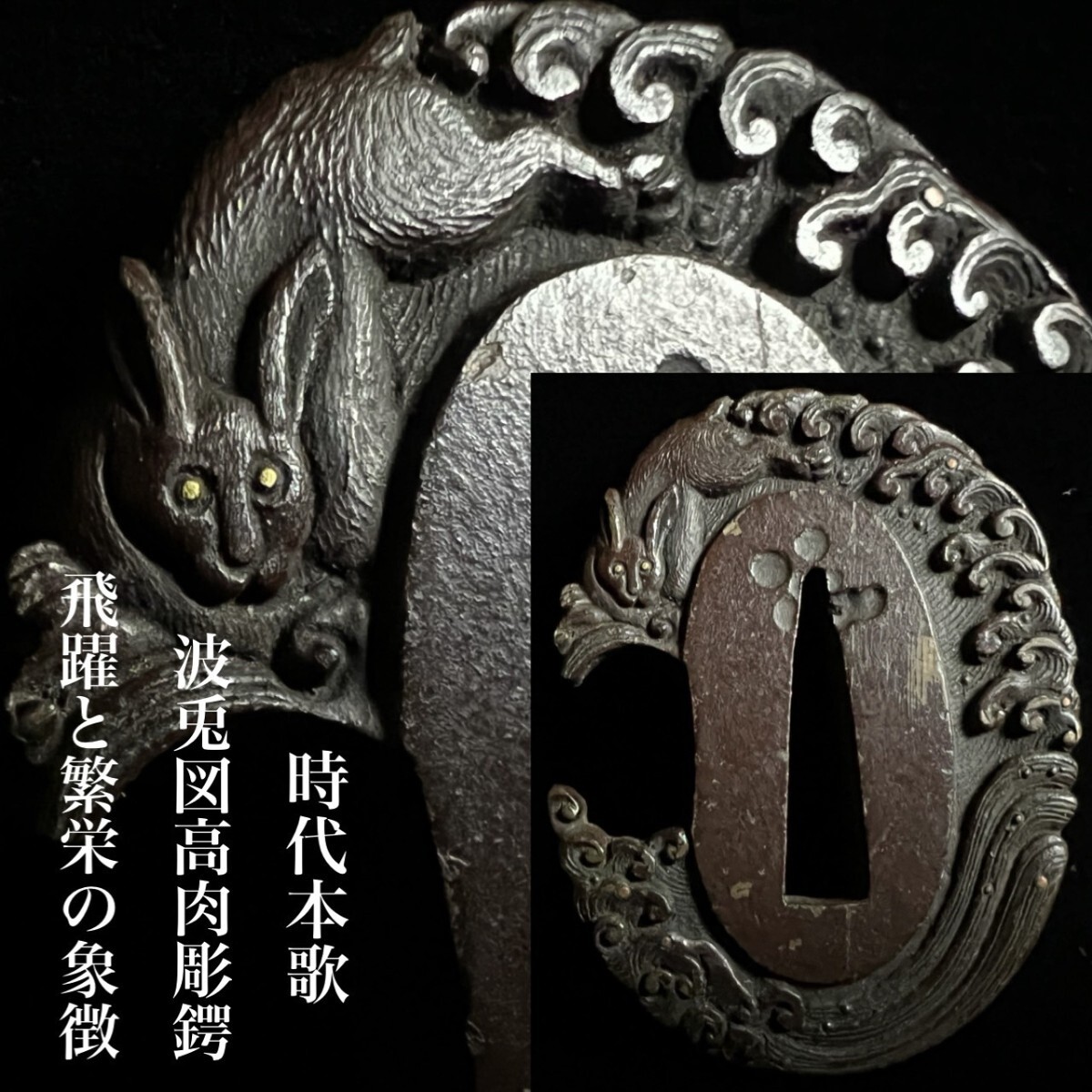 > 刀剣美術 時代 本歌 波兎図鍔 5.35cm 71g 高肉彫 金象嵌 極厚 細密彫刻 飛躍と繁栄の象徴 縁起物 竹生島 刀装具 短刀 鐔 刀剣武具骨董[麌]