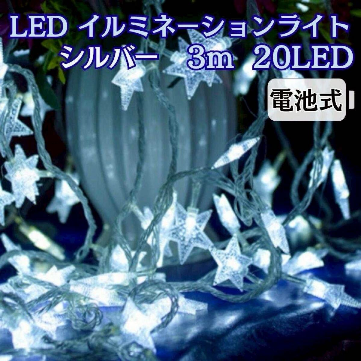 - イルミネーション LED ライト 3m 20LED 星型 電池 電飾 シルバー