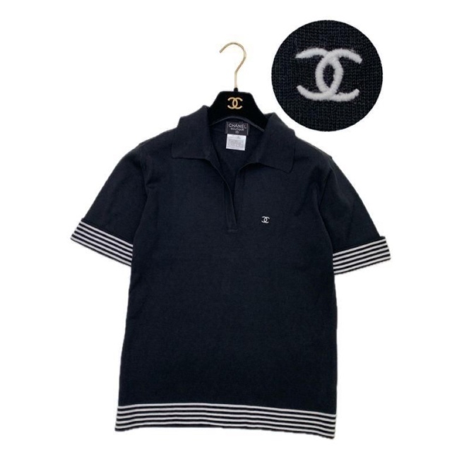 > シャネル CHANEL 黒×白 ボーダー 半袖カットソー ポロシャツ ココマーク刺繍 レア 正規品 ヴィンテージ