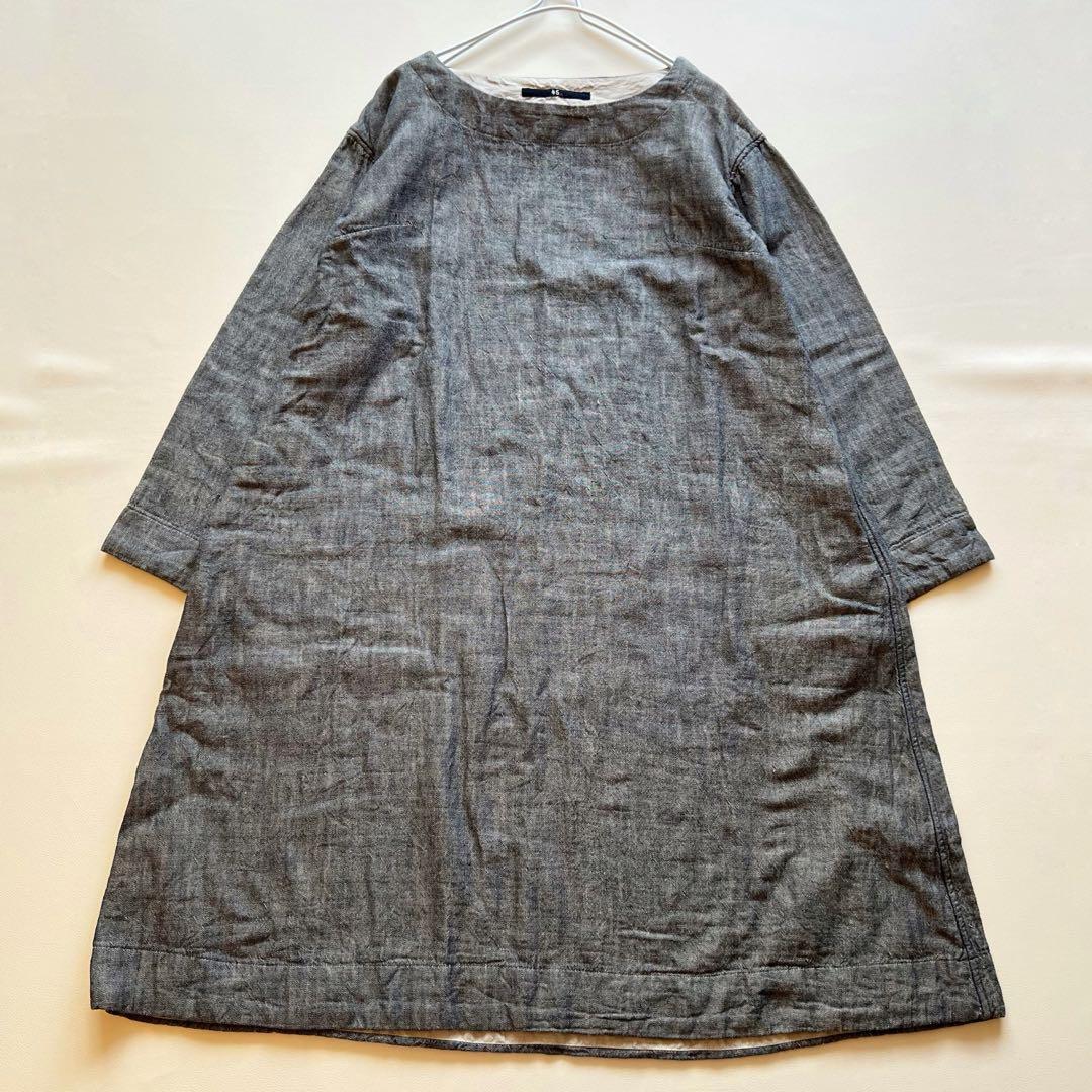 - 美品45R インディゴ ノーカラーワンピース ロング 長袖 裏地ストライプ