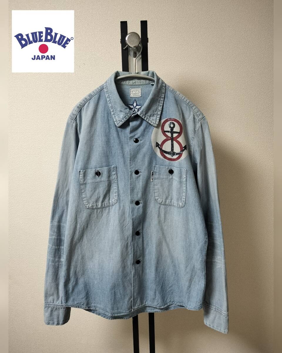 > BLUE BLUE/ブルーブルー/聖林公司/ハリラン/サークルアンカーロゴ×スター刺繍/デニムシャツ/ヴィンテージ加工/赤耳/セルビッチ/SIZE 3/L