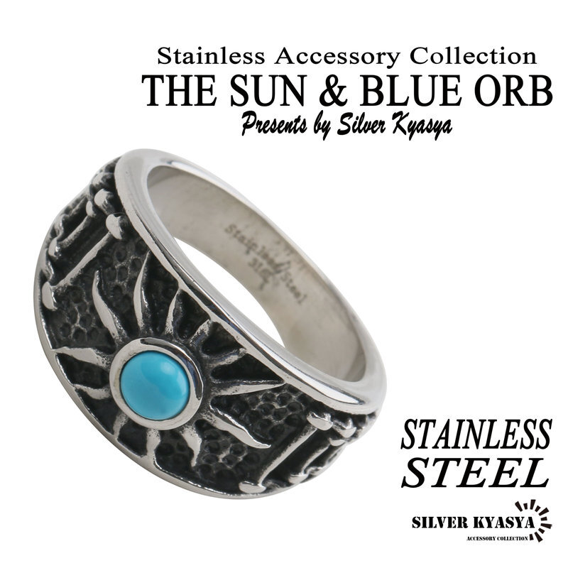 - (19号) ステンレス 太陽 リング 指輪 ターコイズブルー シルバー 銀色 バイクチェーン ごつめ