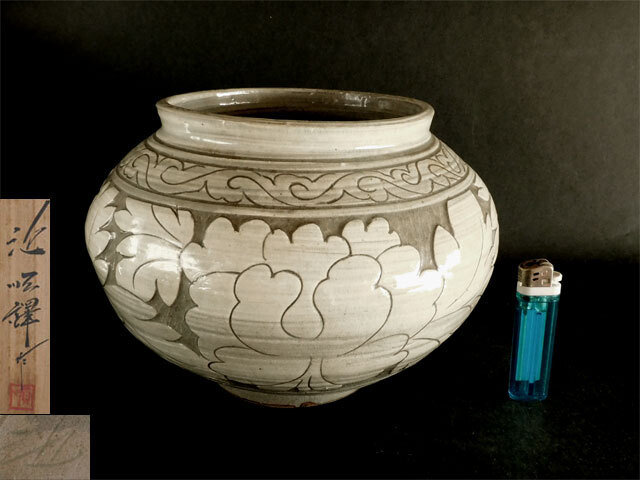 - 韓国人間国宝 池順鐸 粉青沙器 掻落 花文 壺 花瓶