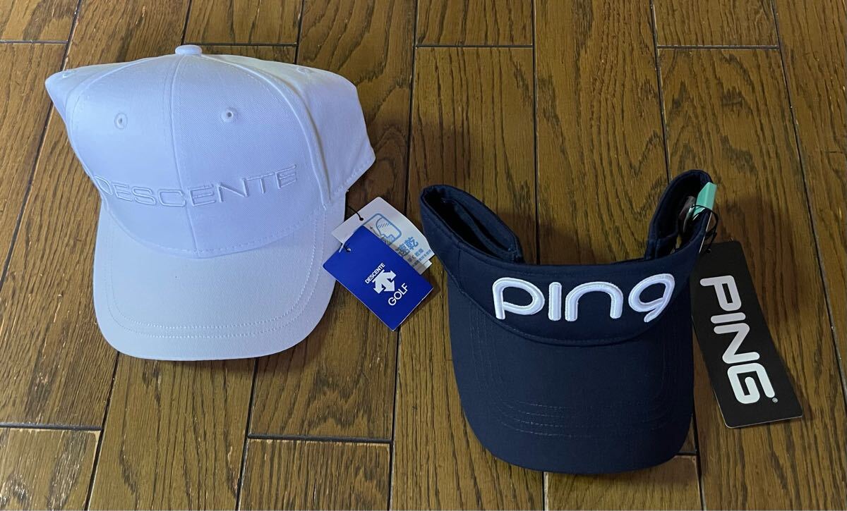 - ゴルフ GOLF PINGサンバイザー フリーサイズ DESCENTEキャップ Mサイズの2ヶ 新品未使用品です。