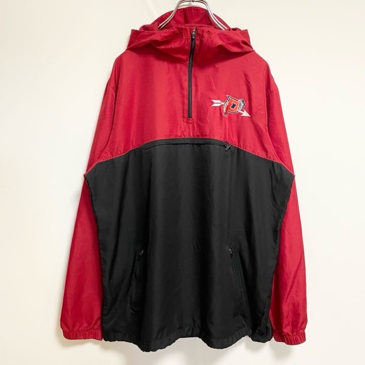 - 古着 used Pennant 長袖ハーフジップナイロンジャケット ワンポイント刺〓 バイカラー 赤 黒 秋冬服 Mサイズ