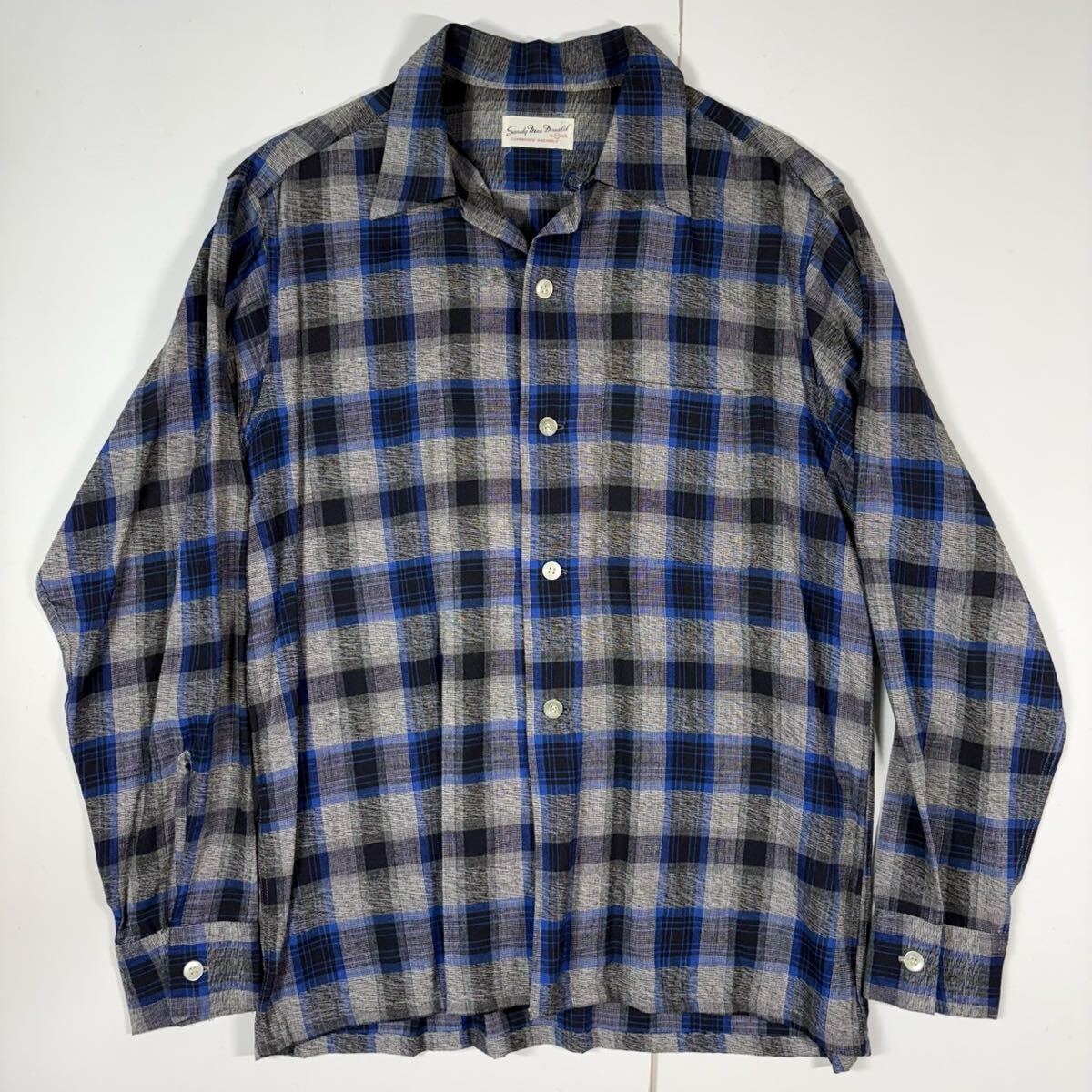 - 【M】60s Vintage Rayon Check Shirt Blue 60年代 ビンテージ レーヨン チェック 開襟 長袖 シャツ ブルー T1458