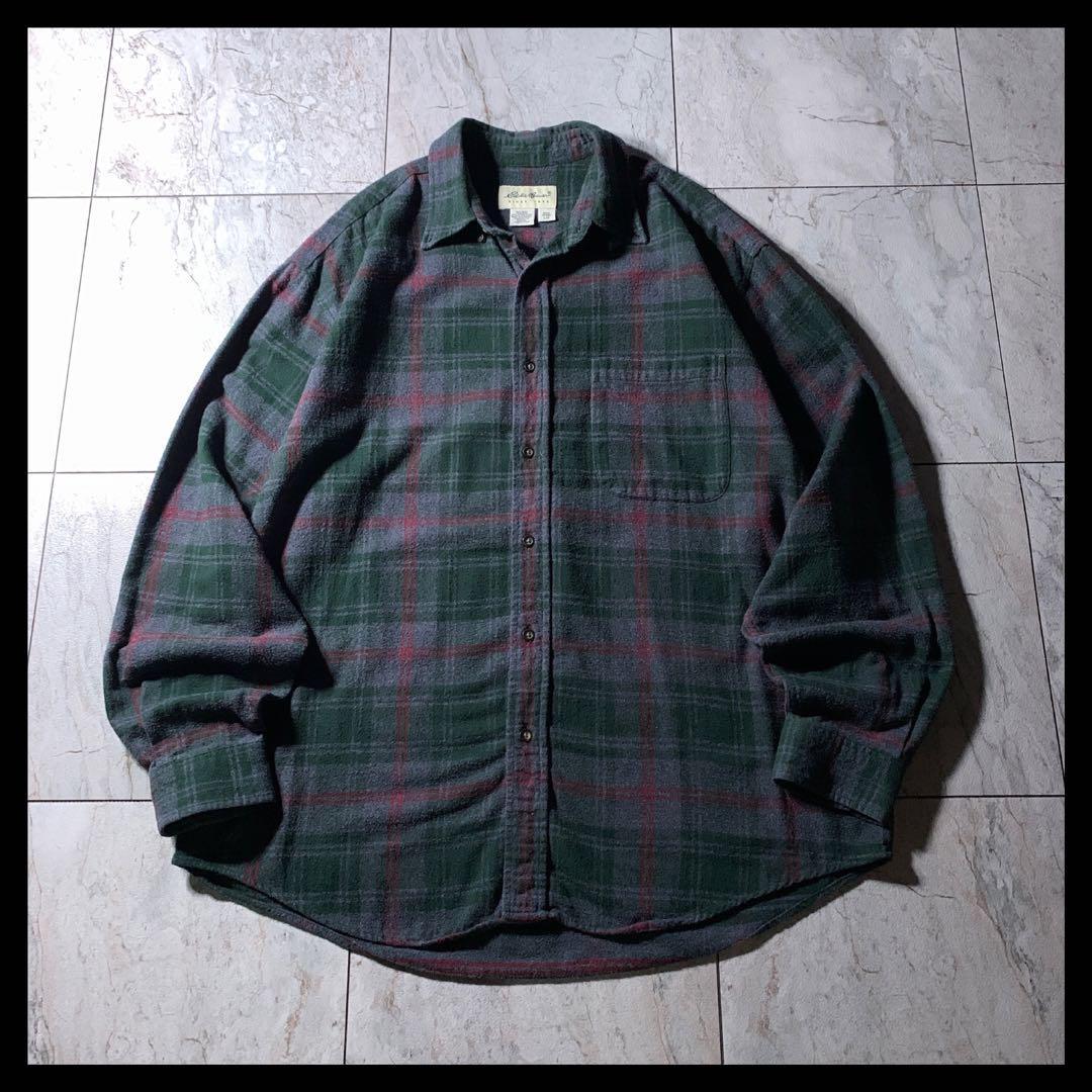 - 90s〜 Eddie Bauer コットン フランネルシャツ チェック 緑グレー