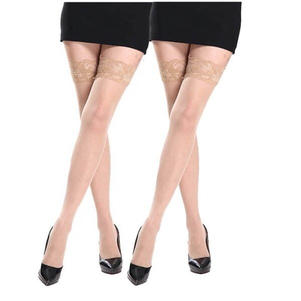 - ニーハイストッキング 太もも丈 花柄レース シリコンストッパー付き 15デニール レディース フリーサイズ ベージュ 2足セット