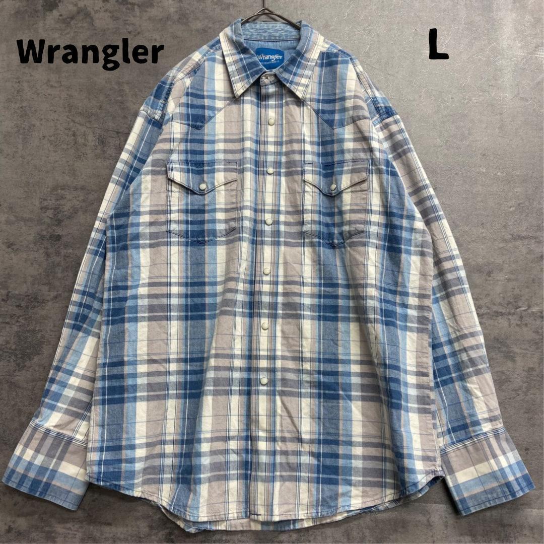 - ラングラー チェックシャツ 長袖 Lサイズ 青×白 デニム生地【5813】