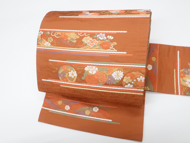 - 《京都一輝堂》リサイクル着物 九寸名古屋帯 六通柄 古典 花蝶文 金糸 正絹 25b08-1599