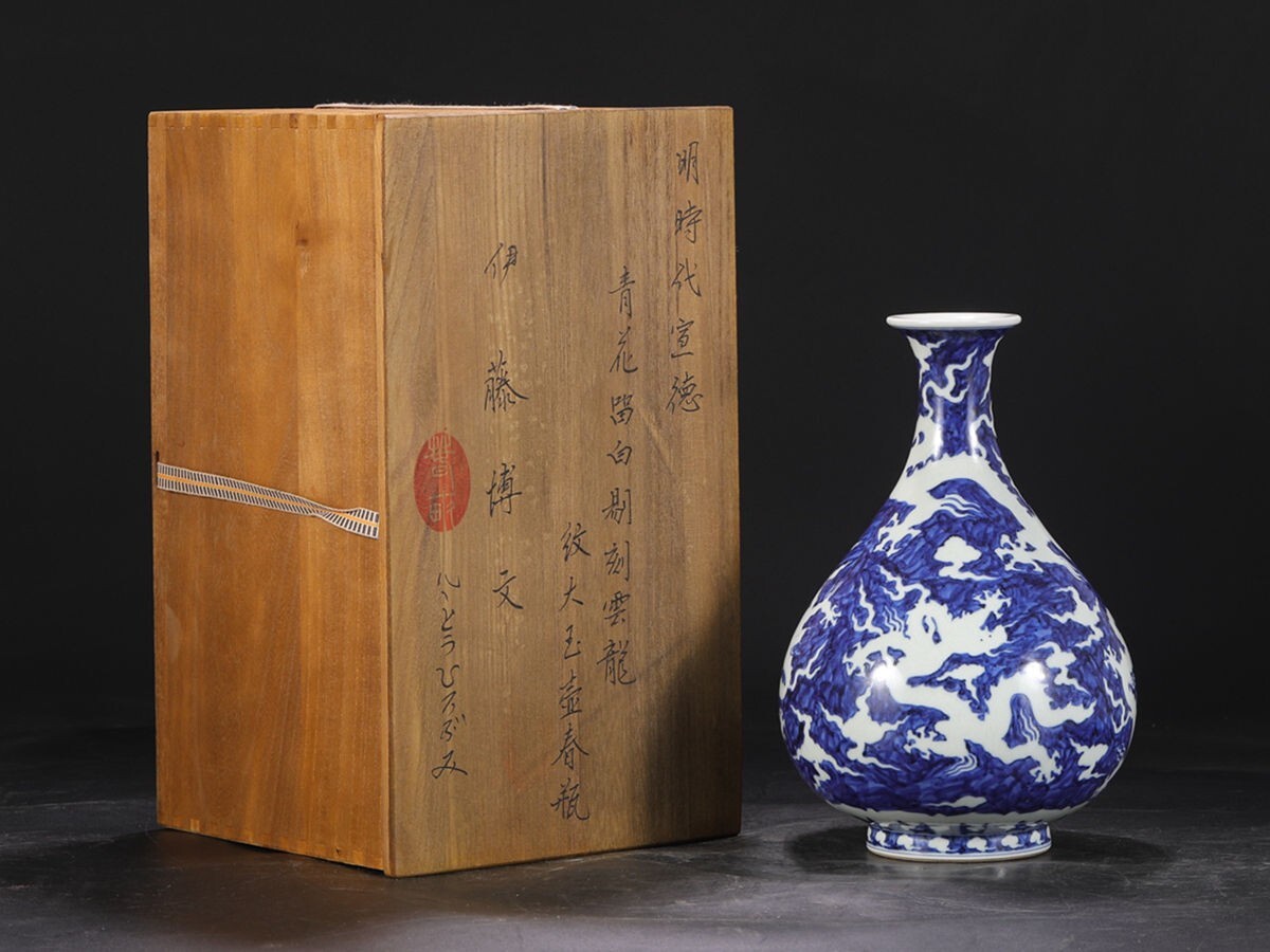- 「明 宣徳年製 陶磁器 青花留白剔刻雲龍紋 大玉壺春瓶」染付 置物 擺件 古賞物 中国古美術 旧蔵出