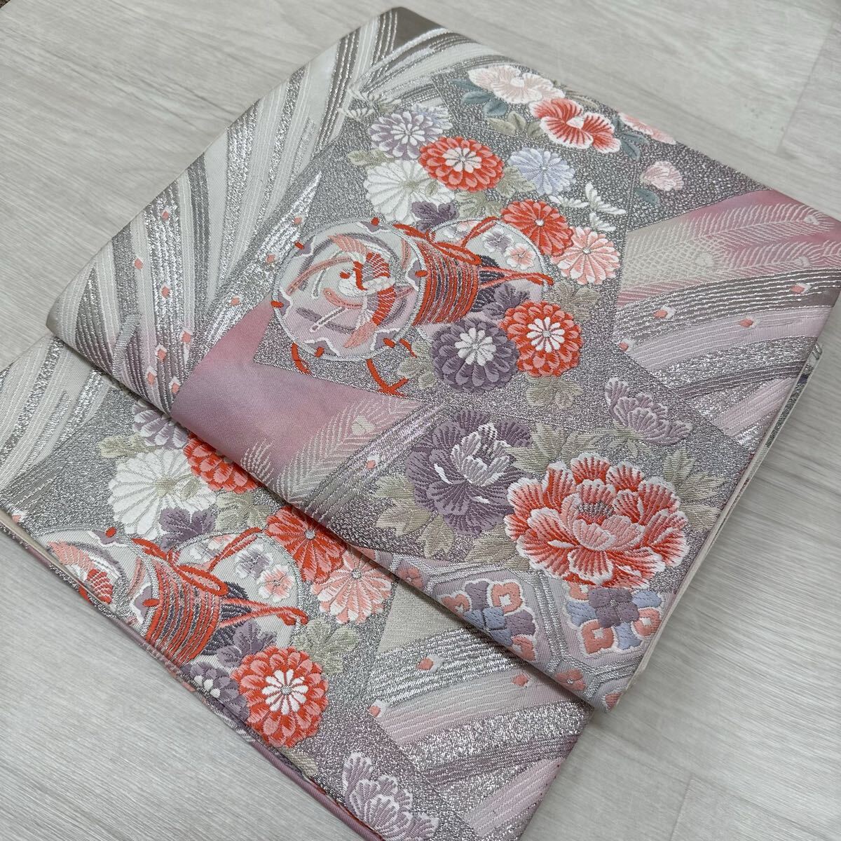> 袋帯 プラチナ箔 色紙取孔雀文 美しい織出し 正絹 着物 W-4493